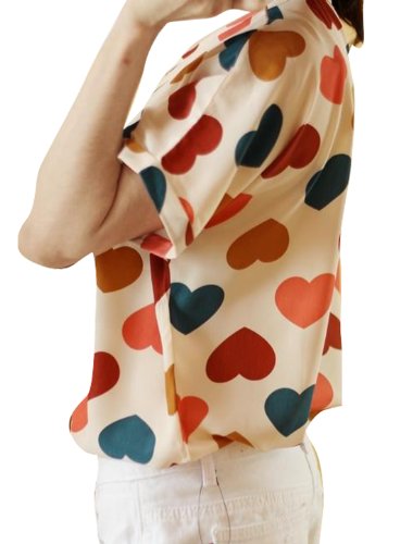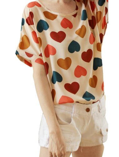 - Scoop Neck, Short Sleeve, Pullover, Hearts, Cuffed, Multicolor, Casual Loose Blouse.