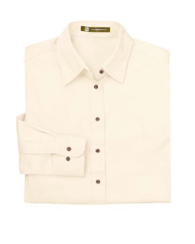 Harriton Ladies' Long-Sleeve Twill Shirt with Stain-Release Button Down Shirt: 55% cotton, 45% polyester with stain-release; extra stitching at seams and buttons; flat-felled seam finishing; signature horn-style buttons with Harriton logo; darts and princess seams; two-button adjustable cuffs; spread collar.