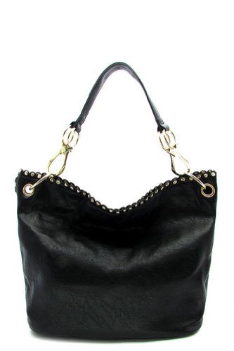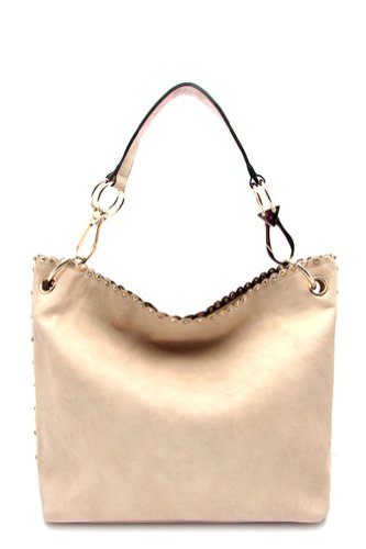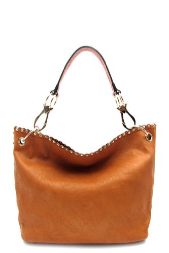 - Golden tone hardware and top zippered closure. Fine textured man-made leather.
