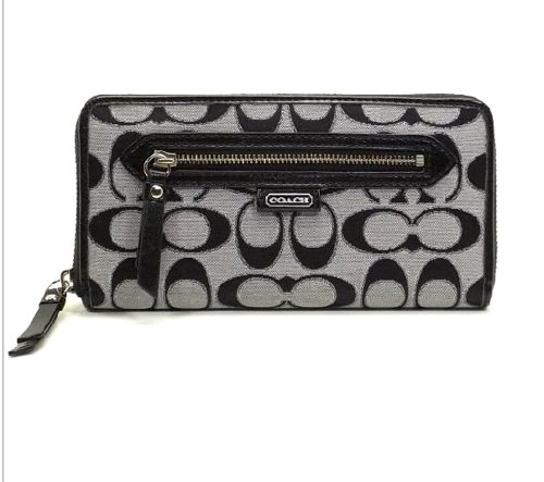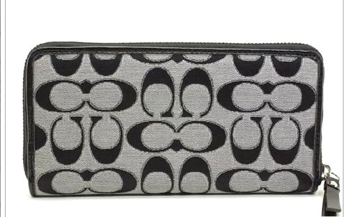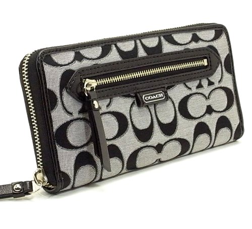 Wrapped in Coach's iconic Signature C print in dual tone. Fabric is specially treated to be water repellent. The wallet is a zip around style with a leather pull. There is a zipped pocket on the front. The interior is leather and sateen and contains 12 credit card slots, a zippered coin compartment and multiple bill slots.