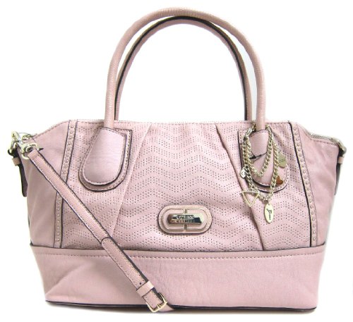 Perforated detail accented with gold-tone hardware and studs. Feminine flair to this sleek satchel bag by Guess. Designed with multiple pockets and signature detailing with removable charm key-fob.